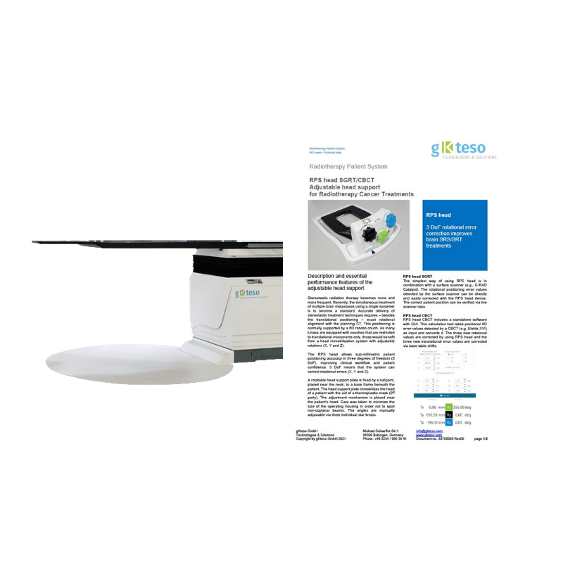 The RPS Head delivers high-precision positioning for cranial and head-and-neck radiotherapy. With integrated 6DoF motion control, it enables submillimeter correction in pitch, roll, and yaw even after the thermoplastic mask is fixed. Designed for stereotactic and image-guided workflows, it ensures stable geometry, minimizes repositioning, and supports accurate SGRT and CBCT verification throughout every treatment session.
